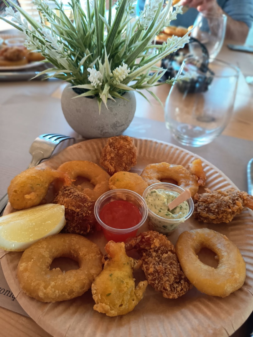 Presque les pieds dans l’eau pour la quarantaine d’adhérents venus admirer le spectacle de l’estuaire de la Seudre avec un gros coefficient de marée (105) et savourer une assiette de beignets de fruits de mer dans un cadre très agréable.